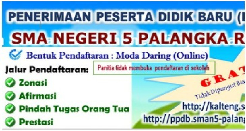 SMA Negeri 5 Palangka Raya kembali melaksanakan Penerimaan Peserta Didik Baru (PPDB) Tahun Pelajaran 2020/2021. Proses penerimaan dilaksanakan secara online, panitia sekolah tidak melayani pendaftaran di lingkungan sekolah. Informasi lengkap dapat dilihat di sini