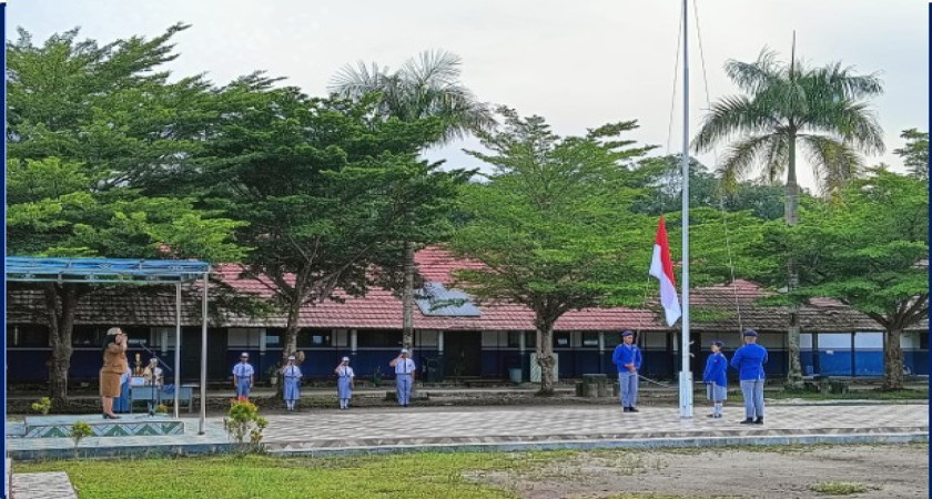 Cuaca mendung tidak menghambat upacara. Justru keteduhan dan kesejukan semakin membuat rangkaian upacara di lapangan SMA Negeri 5 Palangka Raya lebih khidmat. Pembina upacara, Nurliani